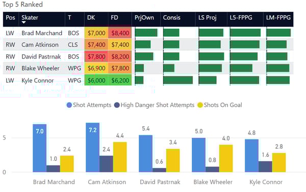 For tonight, here's my top 12 ranked lines on the night. I've included data bars for ownership, consistency, fantasy points, LineStar projected, and my personal rank on the night.