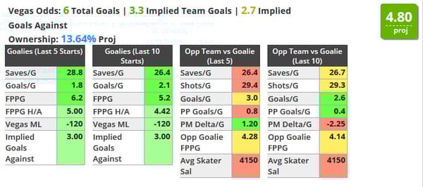 This is your starting point when playing cash games. You want a goalie that has a solid chance to get a win, but will also face a decent number of shots. North of 30 shots on net is ideal. Here are my three favorites that check those boxes tonight: