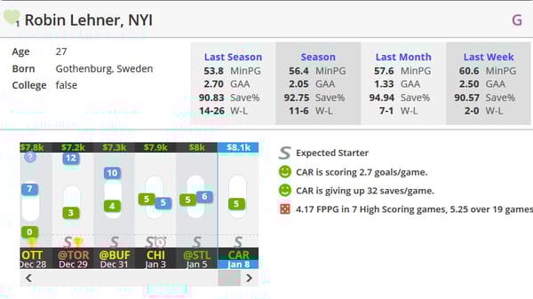 Robin Lehner (vs CAR) (DK: $8.1K, FD: $8.3K)