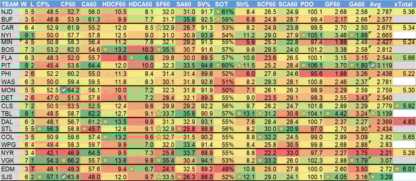 W = wins, L = losses (excluding OT losses), CF% = Corsi (shot attempts) For %, CF60 = Corsi for per 60 minutes, CA60 = Corsi allowed per 60 minutes, HDCF60 = High danger Corsi for per 60 minutes, HDCA60 = High danger Corsi allowed per 60 minutes, SF60 = shots for on net per 60 minutes, SA60 = shots on net allowed per 60 minutes, SV% = save percentage, SOT = shots on target (percentage of shots taken that hit the goal or go in), Sh% = shooting percentage (% of shots that become goals), SCF60 = scoring chances for per 60 minutes, SCA60 = scoring chances allowed per 60 minutes, PDO = Called SPSV% by the NHL, is the sum of a team's shooting percentage and its save percentage, GF60 = goals for per 60 minutes, GA60 = goals allowed per 60 minutes, Avg = Projected goals (my projections) for the team, xTotal = projected over/under