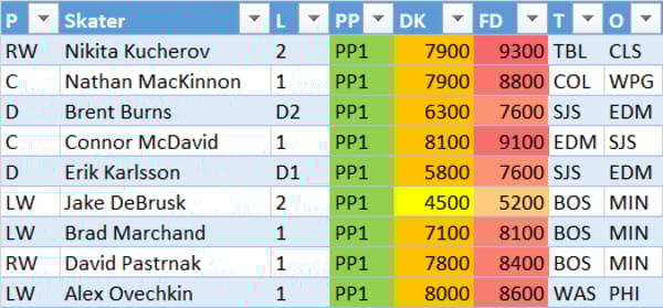 Here's a peek at my personal rankings for tonight. None of these should really be a surprise, but you'll notice that Boston has 3 players in the top 10 and all are on PP1 tonight. It's actually an interesting stack since you get exposure to both top even strength lines as well as the top powerplay unit.