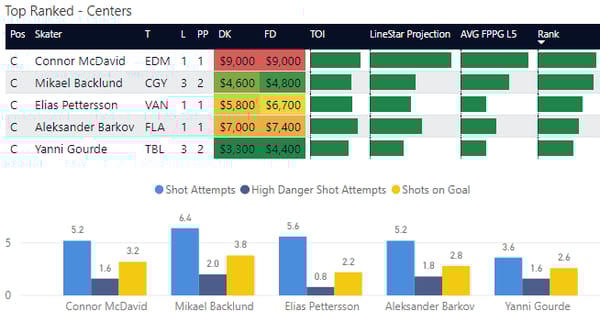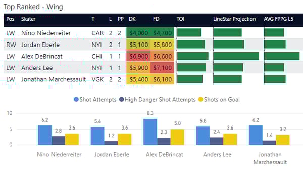 How to Interpret C/D/W charts: In NHL DFS, I think it's most important to look at peripheral stats instead of goals which is why I put so much emphasis on shots. This includes shot attempts, high danger shot attempts (those shot attempts closest to the net with the highest probability of going into the net), and shots on goal. I've included projections and average fantasy points to see how each compares so you can more easily find value.