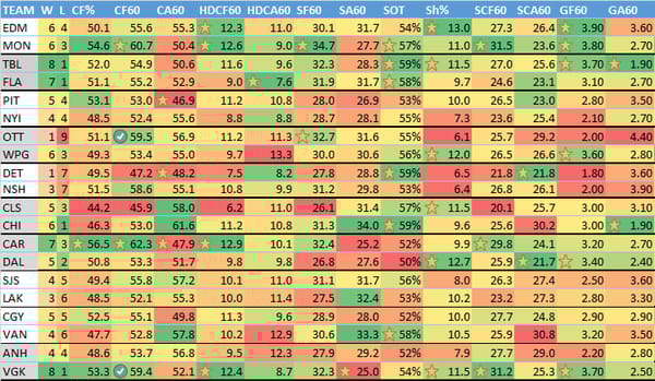 Legend: CF% = Corsi For Percentage, CF60 = Corsi For Per60 min, CA = Corsi Allowed Per 60 Min, HDCF60 = High Danger Corsi For Per 60 Min, HDCA60 = High Danger Corsi Allowed Per 60 Min, SF60 = Shots on Goal For Per 60 Min, SA60 = Shots on Goal Allowed Per 60 Min, SOT = % of Shot Attempts On Goal, Sh% = % of Shots on Goal That Are Goals, SCF60 = Scoring Chances For Per 60 Min, SCA60 = Scoring Chances Allowed Per 60 Min, GF60 = Goals For Per 60 Min, GA60 = Goals Allowed Per 60.
