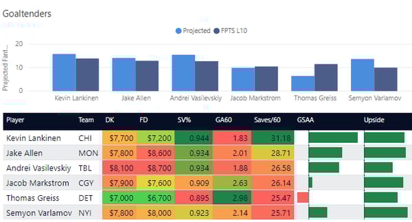 How to Interpret This: I've added LineStar Projected Ownership, LineStar Projected Fantasy Points, and Goalie GAA (Goals Saved Above Average), and Saves/60, along with my projected upside for each goalie. Generally, I'm looking for goalies that I think will get a win with a positive (green) GSAA and a high saves number.