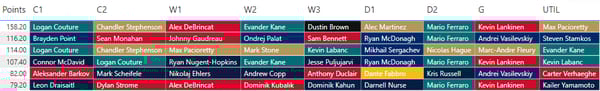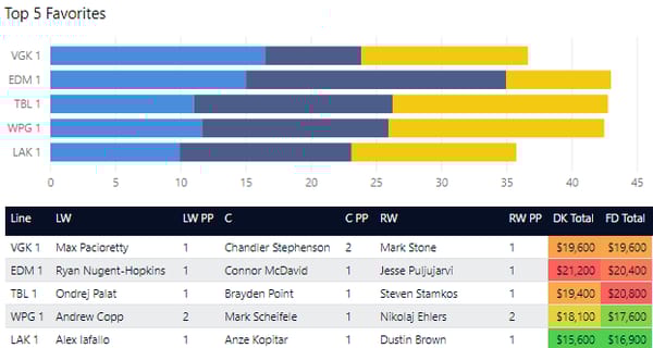 If you look at my lineups, my best lineup was a 3-3 stack with a CWD lineup stack. That allowed me to fit a DeBrincat and Dustin Brown one-off. That got me thinking that (and I'm sure I've said this before) I'm spending too much effort forcing 3-3 full forward stacks. I think full forward stack goals are rare and I have a better chance picking up fantasy points by including defensemen in my stacks that will see time with most of the forward lines.