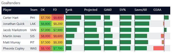 Mostly, I'm trying to give a little more transparency into who I like for the night and is worth considering. I don't believe in locks or must plays. So with goalies, I usually hover around the top spots and split exposure. In baseball, I'll often swap pitchers if I get a lineup with all the hitters I like. Same applies with goalies. If you build a lineup and like your skaters, but aren't certain on goalies, don't be afraid to create a second lineup with your second favorite goalie.
