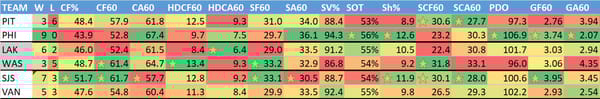 W = wins, L = losses (excluding OT losses), CF% = Corsi (shot attempts) For %, CF60 = Corsi for per 60 minutes, CA60 = Corsi allowed per 60 minutes, HDCF60 = High danger Corsi for per 60 minutes, HDCA60 = High danger Corsi allowed per 60 minutes, SF60 = shots for on net per 60 minutes, SA60 = shots on net allowed per 60 minutes, SV% = save percentage, SOT = shots on target (percentage of shots taken that hit the goal or go in), Sh% = shooting percentage (% of shots that become goals), SCF60 = scoring chances for per 60 minutes, SCA60 = scoring chances allowed per 60 minutes, PDO = Called SPSV% by the NHL, is the sum of a team's shooting percentage and its save percentage, GF60 = goals for per 60 minutes, GA60 = goals allowed per 60 minutes.