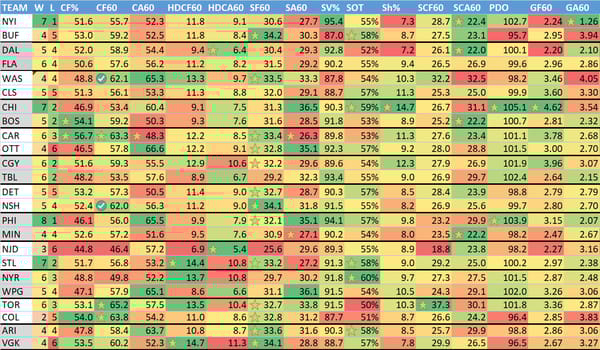 W = wins, L = losses (excluding OT losses), CF% = Corsi (shot attempts) For %, CF60 = Corsi for per 60 minutes, CA60 = Corsi allowed per 60 minutes, HDCF60 = High danger Corsi for per 60 minutes, HDCA60 = High danger Corsi allowed per 60 minutes, SF60 = shots for on net per 60 minutes, SA60 = shots on net allowed per 60 minutes, SV% = save percentage, SOT = shots on target (percentage of shots taken that hit the goal or go in), Sh% = shooting percentage (% of shots that become goals), SCF60 = scoring chances for per 60 minutes, SCA60 = scoring chances allowed per 60 minutes, PDO = Called SPSV% by the NHL, is the sum of a team's shooting percentage and its save percentage, GF60 = goals for per 60 minutes, GA60 = goals allowed per 60 minutes.