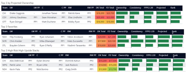 Line stacking is a common strategy in GPP. You’ll see a lot of winning lineups where players are stacked from the same forward lines or power play lines.