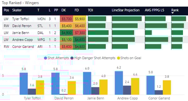 How to Interpret C/D/W charts: In NHL DFS, I think it's most important to look at peripheral stats instead of goals which is why I put so much emphasis on shots. This includes shot attempts, high danger shot attempts (those shot attempts closest to the net with the highest probability of going into the net), and shots on goal. I've included projections and average fantasy points to see how each compares so you can more easily find value.