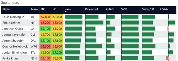 Mostly, I'm trying to give a little more transparency into who I like for the night and is worth considering. I don't believe in locks or must plays. So with goalies, I usually hover around the top spots and split exposure. In baseball, I'll often swap pitchers if I get a lineup with all the hitters I like. Same applies with goalies. If you build a lineup and like your skaters, but aren't certain on goalies, don't be afraid to create a second lineup with your second favorite goalie.