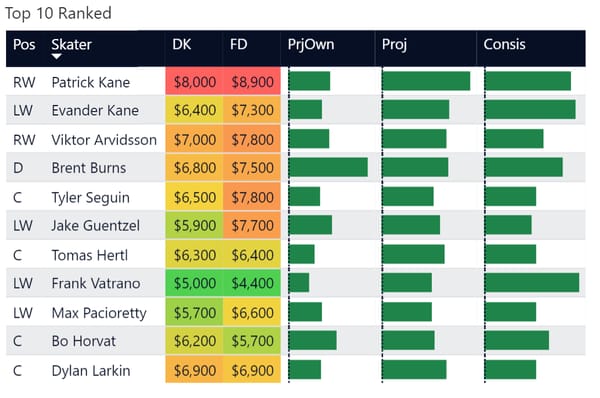 For tonight, here are my top 12 ranked lines on the night. I've included data bars for ownership, consistency, fantasy points, LineStar projected, and my personal rank on the night.