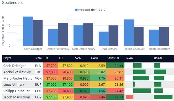 How to Interpret This: I've added LineStar Projected Ownership, LineStar Projected Fantasy Points, and Goalie GAA (Goals Saved Above Average), and Saves/60, along with my projected upside for each goalie. Generally, I'm looking for goalies that I think will get a win with a positive (green) GSAA and a high saves number.