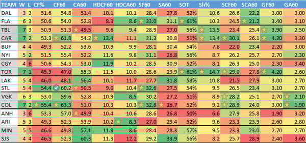 Here's numbers on the teams from their past 10 games. Generally, I start my research by looking for teams in good spots. For example, teams that score goals (GF60) that are facing teams that give up goals (GA60). I also look at teams that shoot a lot (CF60) that are facing teams that give up a lot of shots (CA60).