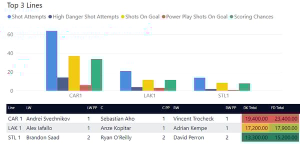 Line stacking is a common strategy in GPP. You’ll see a lot of winning lineups where players are stacked from the same forward lines or power play lines. DraftKings allows a maximum of 6 skaters from the same team (with skaters from at least 3 teams) and FanDuel allows a maximum of 4 skaters from one team. In tournaments, you'll often see 3-3 stacks (meaning 3 players from one team and 3 from another team), 4-3, and 3-3-2 stacks.