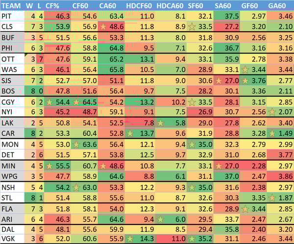 W = wins, L = losses (excluding OT losses), CF% = Corsi (shot attempts) For %, CF60 = Corsi for per 60 minutes (more is better), CA60 = Corsi allowed per 60 minutes, HDCF60 = High danger Corsi for per 60 minutes, HDCA60 = High danger Corsi allowed per 60 minutes, SF60 = shots for on net per 60 minutes, SA60 = shots on net allowed per 60 minutes, GF60 = goals for per 60 minutes, GA60 = goals allowed per 60 minutes.