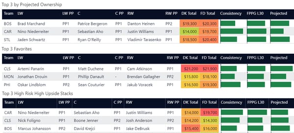 Line stacking is a common strategy in GPP. You’ll see a lot of winning lineups where players are stacked from the same forward lines or power play lines. DraftKings allows a maximum of 6 skaters from the same team (with skaters from at least 3 teams) and FanDuel allows a maximum of 4 skaters from one team. In tournaments, you'll often see 3-3 stacks (meaning 3 players from one team and 3 from another team), 4-3, and 3-3-2 stacks.