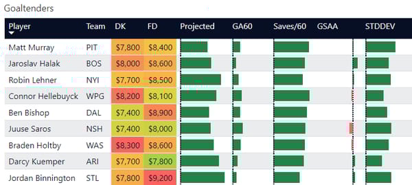 Mostly, I'm trying to give a little more transparency into who I like for the night and who is worth considering. I don't believe in locks or must plays. So with goalies, I usually hover around the top spots and split exposure. In baseball, I'll often swap pitchers if I get a lineup with all the hitters I like. Same applies with goalies. If you build a lineup and like your skaters, but aren't certain on goalies, don't be afraid to create a second lineup with your second favorite goalie.