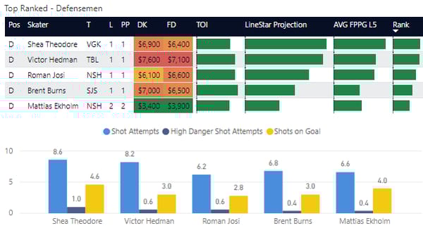 How to Interpret C/D/W charts: In NHL DFS, I think it's most important to look at peripheral stats instead of goals which is why I put so much emphasis on shots. This includes shot attempts, high danger shot attempts (those shot attempts closest to the net with the highest probability of going into the net), and shots on goal. I've included projections and average fantasy points to see how each compares so you can more easily find value.