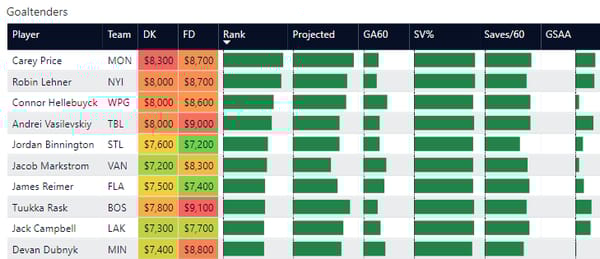 Mostly, I'm trying to give a little more transparency into who I like for the night and is worth considering. I don't believe in locks or must plays. So with goalies, I usually hover around the top spots and split exposure. In baseball, I'll often swap pitchers if I get a lineup with all the hitters I like. Same applies with goalies. If you build a lineup and like your skaters, but aren't certain on goalies, don't be afraid to create a second lineup with your second favorite goalie.