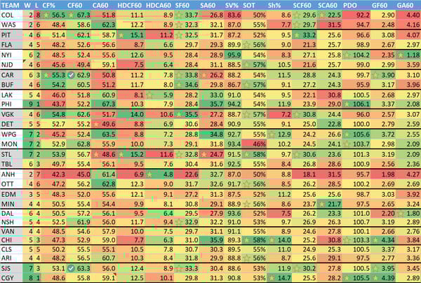 W = wins, L = losses (excluding OT losses), CF% = Corsi (shot attempts) For %, CF60 = Corsi for per 60 minutes, CA60 = Corsi allowed per 60 minutes, HDCF60 = High danger Corsi for per 60 minutes, HDCA60 = High danger Corsi allowed per 60 minutes, SF60 = shots for on net per 60 minutes, SA60 = shots on net allowed per 60 minutes, SV% = save percentage, SOT = shots on target (percentage of shots taken that hit the goal or go in), Sh% = shooting percentage (% of shots that become goals), SCF60 = scoring chances for per 60 minutes, SCA60 = scoring chances allowed per 60 minutes, PDO = Called SPSV% by the NHL, is the sum of a team's shooting percentage and its save percentage, GF60 = goals for per 60 minutes, GA60 = goals allowed per 60 minutes.