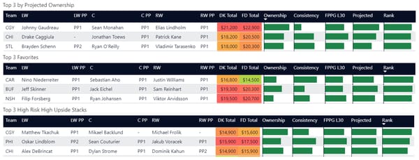 Line stacking is a common strategy in GPP. You’ll see a lot of winning lineups where players are stacked from the same forward lines or power play lines.