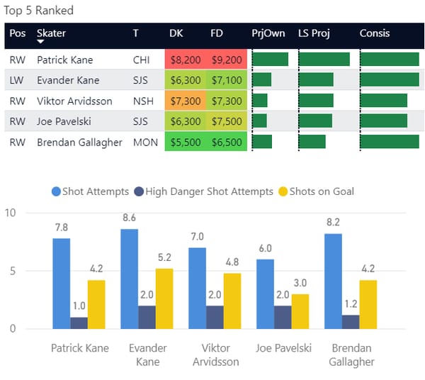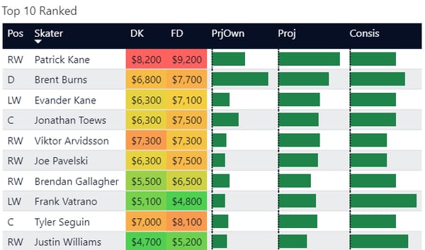 Here are my rankings for players on the slate. Now, these are my own personal rankings based on player performance over the past 5 and 10 games along with matchup and my own sauce. While it's far from perfect, I think it can be helpful if you're new to NHL or have trouble with 1v1 comparisons.