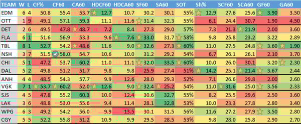 Here's numbers on the teams from their past 10 games. Generally, I start my research by looking for teams in good spots. For example, teams that score goals (GF60) that are facing teams that give up goals (GA60). I also look at teams that shoot a lot (CF60) that are facing teams that give up a lot of shots (CA60).