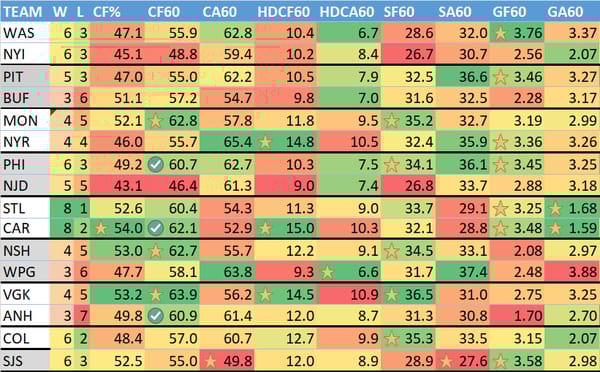 W = wins, L = losses (excluding OT losses), CF% = Corsi (shot attempts) For %, CF60 = Corsi for per 60 minutes (more is better), CA60 = Corsi allowed per 60 minutes, HDCF60 = High danger Corsi for per 60 minutes, HDCA60 = High danger Corsi allowed per 60 minutes, SF60 = shots for on net per 60 minutes, SA60 = shots on net allowed per 60 minutes, GF60 = goals for per 60 minutes, GA60 = goals allowed per 60 minutes.