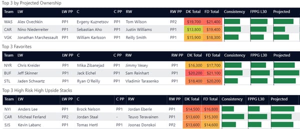 Line stacking is a common strategy in GPP. You’ll see a lot of winning lineups where players are stacked from the same forward lines or power play lines. DraftKings allows a maximum of 6 skaters from the same team (with skaters from at least 3 teams) and FanDuel allows a maximum of 4 skaters from one team. In tournaments, you'll often see 3-3 stacks (meaning 3 players from one team and 3 from another team), 4-3, and 3-3-2 stacks.