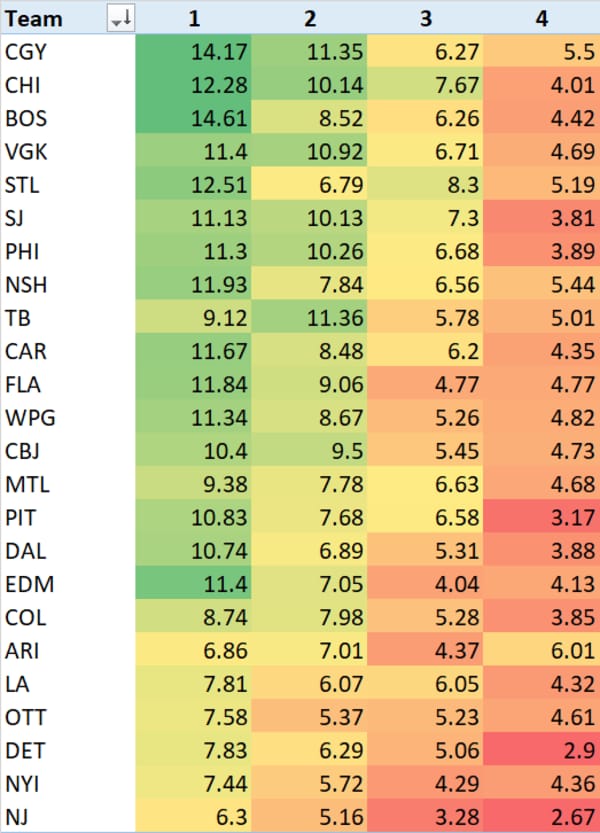 Here's something new for you all - I aggregated LineStar projections for the top 4 lines for each team and presented them here. It gives you a visual indication of how lines compare to each other.