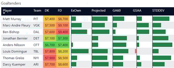 Mostly, I'm trying to give a little more transparency into who I like for the night and who is worth considering. I don't believe in locks or must plays. So with goalies, I usually hover around the top spots and split exposure. In baseball, I'll often swap pitchers if I get a lineup with all the hitters I like. Same applies with goalies. If you build a lineup and like your skaters, but aren't certain on goalies, don't be afraid to create a second lineup with your second favorite goalie.