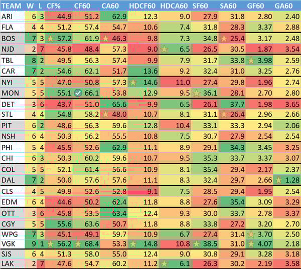 W = wins, L = losses (excluding OT losses), CF% = Corsi (shot attempts) For %, CF60 = Corsi for per 60 minutes (more is better), CA60 = Corsi allowed per 60 minutes, HDCF60 = High danger Corsi for per 60 minutes, HDCA60 = High danger Corsi allowed per 60 minutes, SF60 = shots for on net per 60 minutes, SA60 = shots on net allowed per 60 minutes, GF60 = goals for per 60 minutes, GA60 = goals allowed per 60 minutes.