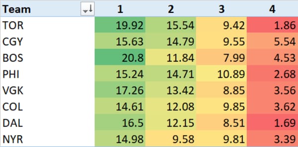 Here's something new for you all - I aggregated LineStar projections for the top 4 lines for each team and presented them here. It gives you a visual indication of how lines compare to each other.