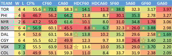 W = wins, L = losses (excluding OT losses), CF% = Corsi (shot attempts) For %, CF60 = Corsi for per 60 minutes (more is better), CA60 = Corsi allowed per 60 minutes, HDCF60 = High danger Corsi for per 60 minutes, HDCA60 = High danger Corsi allowed per 60 minutes, SF60 = shots for on net per 60 minutes, SA60 = shots on net allowed per 60 minutes, GF60 = goals for per 60 minutes, GA60 = goals allowed per 60 minutes.