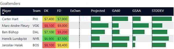 Mostly, I'm trying to give a little more transparency into who I like for the night and who is worth considering. I don't believe in locks or must plays. So with goalies, I usually hover around the top spots and split exposure. In baseball, I'll often swap pitchers if I get a lineup with all the hitters I like. Same applies with goalies. If you build a lineup and like your skaters, but aren't certain on goalies, don't be afraid to create a second lineup with your second favorite goalie.