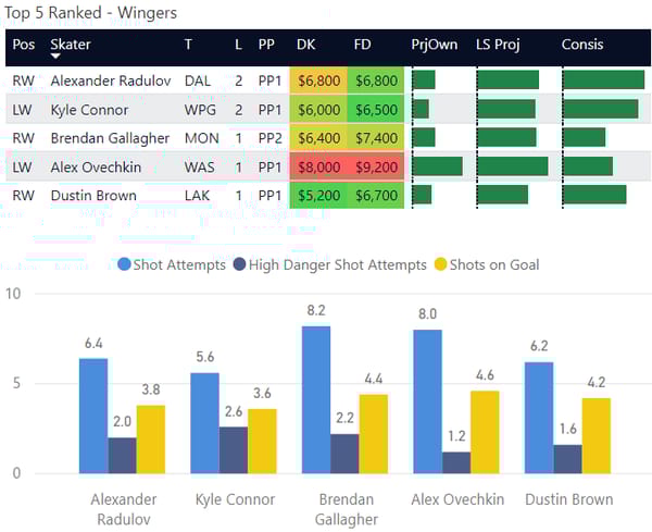 Next, let's look at wingers - and like I mentioned, NHL is all about correlation. When building your lineups, always think of who you can pair together. If there's a center that you love, it's probably a good idea to find a winger or defenseman to pair him with.