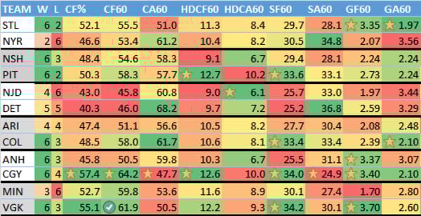 W = wins, L = losses (excluding OT losses), CF% = Corsi (shot attempts) For %, CF60 = Corsi for per 60 minutes (more is better), CA60 = Corsi allowed per 60 minutes, HDCF60 = High danger Corsi for per 60 minutes, HDCA60 = High danger Corsi allowed per 60 minutes, SF60 = shots for on net per 60 minutes, SA60 = shots on net allowed per 60 minutes, GF60 = goals for per 60 minutes, GA60 = goals allowed per 60 minutes.