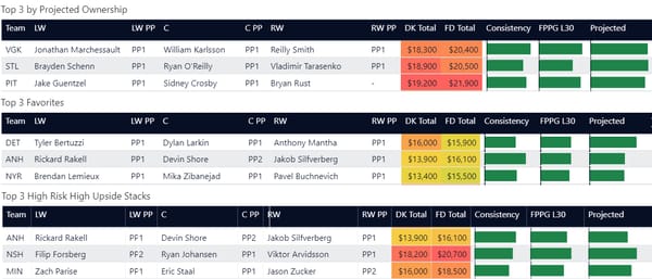 Line stacking is a common strategy in GPP. You’ll see a lot of winning lineups where players are stacked from the same forward lines or power play lines. DraftKings allows a maximum of 6 skaters from the same team (with skaters from at least 3 teams) and FanDuel allows a maximum of 4 skaters from one team. In tournaments, you'll often see 3-3 stacks (meaning 3 players from one team and 3 from another team), 4-3, and 3-3-2 stacks.