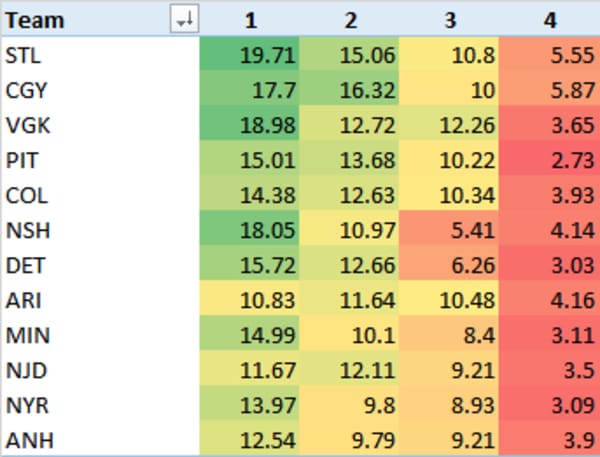 Here's something new for you all - I aggregated LineStar projections for the top 4 lines for each team and presented them here. It gives you a visual indication of how lines compare to each other.
