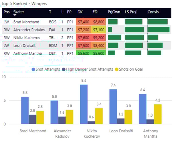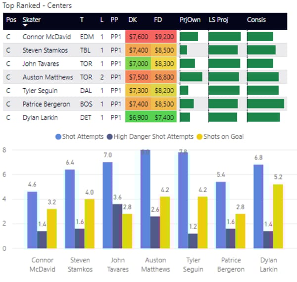 If you take anything away from this, keep in mind that hockey is a high-variance sport. The top ranked player in each category could be a great play or be a dud tonight. Going all in on any player probably isn't a great move.