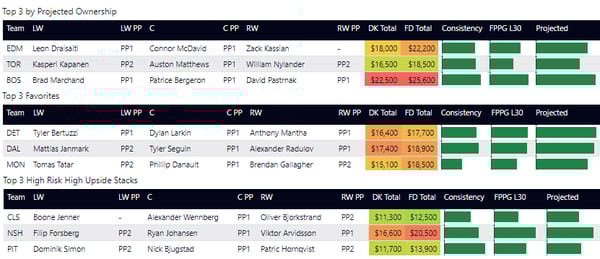 Line stacking is a common strategy in GPP. You’ll see a lot of winning lineups where players are stacked from the same forward lines or power play lines. DraftKings allows a maximum of 6 skaters from the same team (with skaters from at least 3 teams) and FanDuel allows a maximum of 4 skaters from one team. In tournaments, you'll often see 3-3 stacks (meaning 3 players from one team and 3 from another team), 4-3, and 3-3-2 stacks.