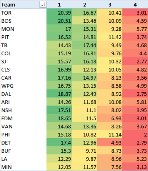 Here's something new for you all - I aggregated LineStar projections for the top 4 lines for each team and presented them here. It gives you a visual indication of how lines compare to each other.