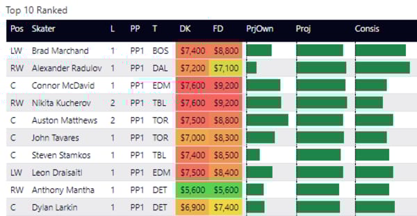Here are my top-ranked skaters overall on the slate. This is based on recent performance and matchup.