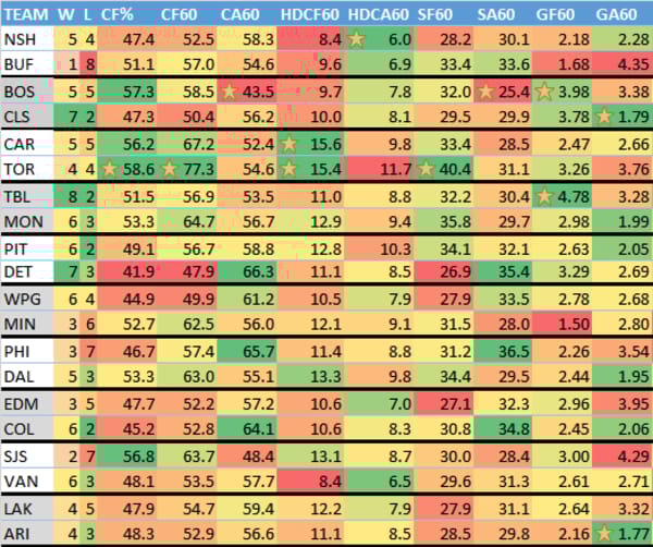 W = wins, L = losses (excluding OT losses), CF% = Corsi (shot attempts) For %, CF60 = Corsi for per 60 minutes (more is better), CA60 = Corsi allowed per 60 minutes, HDCF60 = High danger Corsi for per 60 minutes, HDCA60 = High danger Corsi allowed per 60 minutes, SF60 = shots for on net per 60 minutes, SA60 = shots on net allowed per 60 minutes, GF60 = goals for per 60 minutes, GA60 = goals allowed per 60 minutes.
