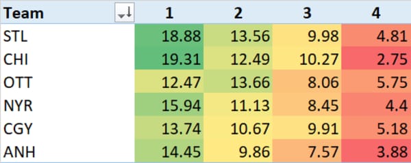 Here's something new for you all - I aggregated LineStar projections for the top 4 lines for each team and presented them here. It gives you a visual indication of how lines compare to each other.