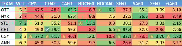 W = wins, L = losses (excluding OT losses), CF% = Corsi (shot attempts) For %, CF60 = Corsi for per 60 minutes (more is better), CA60 = Corsi allowed per 60 minutes, HDCF60 = High danger Corsi for per 60 minutes, HDCA60 = High danger Corsi allowed per 60 minutes, SF60 = shots for on net per 60 minutes, SA60 = shots on net allowed per 60 minutes, GF60 = goals for per 60 minutes, GA60 = goals allowed per 60 minutes.