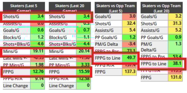 For starters, I almost always want a goalie who can get me 30 saves or more. Check. Next, I’m looking to see if the opposing team is averaging 30 shots or more. Check. Now, this is important. Pay attention to the number of goals allowed and the number of goals the opposing team is scoring. DO THE MATH to get the save percentage. For example, if Andersen made 31 saves and let in 3 goals on average over his past five games, he’s made 31 saves on 34 shots. That makes for a 0.912 save percentage. That’s favorable. If it’s under 0.900, I’ll typically avoid that goalie or stack against him. Notice how the Goals/G numbers are highlighted in red underneath the last 5 and last 10 for Opp Team vs Goalie? That’s not ideal. Is it a reason to fade? Not always, but it depends on the slate and what other options are available.