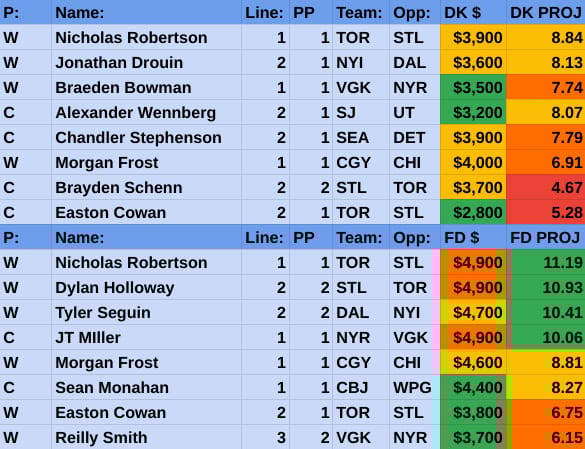 My favorite: Easton Cowan - TOR vs STL (DK: $2700 - FD: $3800)