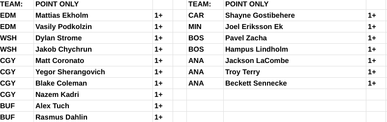 Some people call these "value" plays or "salary savers", but these are players that I like for tonight that fit at the lowest salary tier. It could be they're playing on one of the top forward lines, or it could be that they've been playing well, but these are my cheap calls for a skater to pick up a goal or assist.